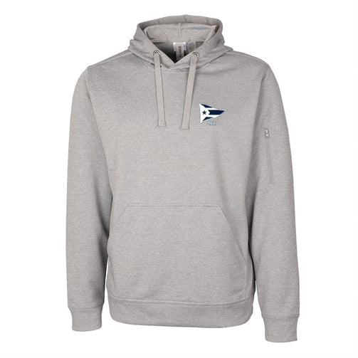 This performance pullover features a hoodie with drawcord, kangaroo pocket with interior cell phone pocket, zip pocket on left sleeve, and self-fabric banded hem & cuff.